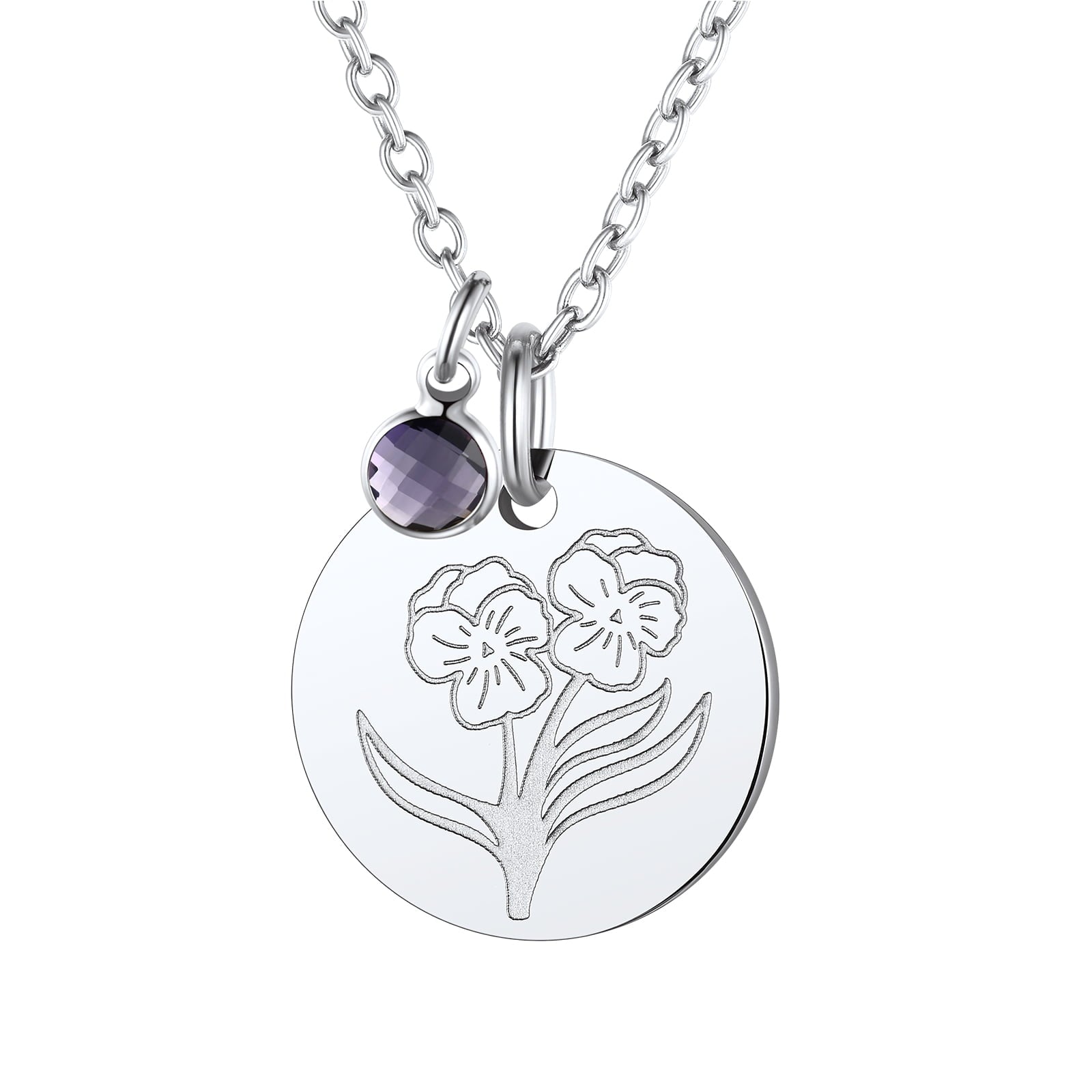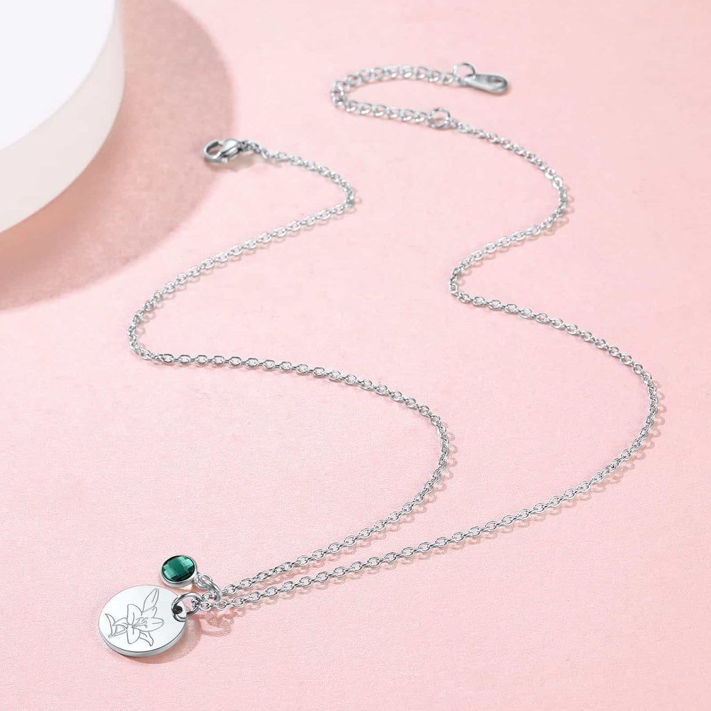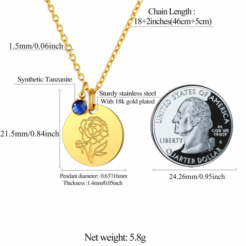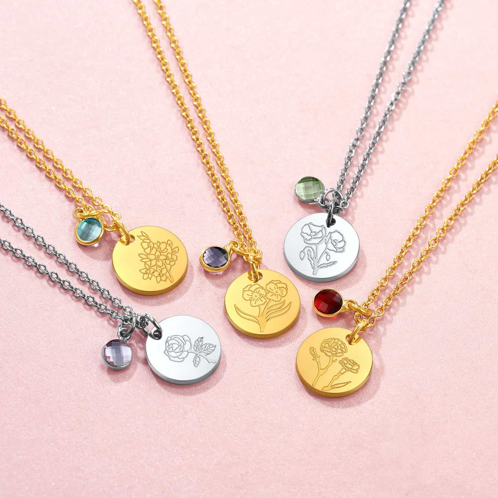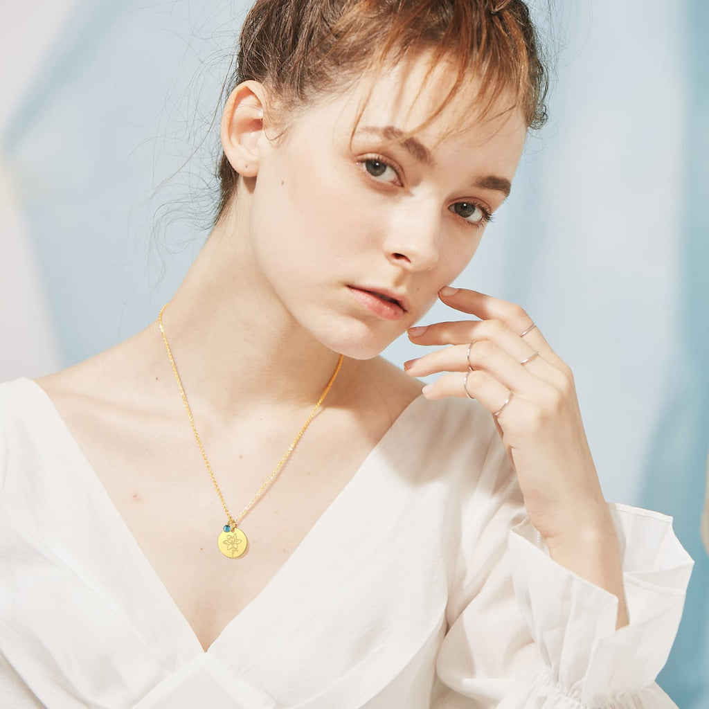 Cute embossed birth flower coin necklace with birthstone, very delicate and classic pendant for women and girls. This kind of minimalist coin necklace is a hit, in fashion and all match with your daily outfit. With meaningful flower hidden message, the disc necklace will deliver your love and blessing.