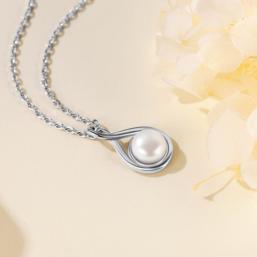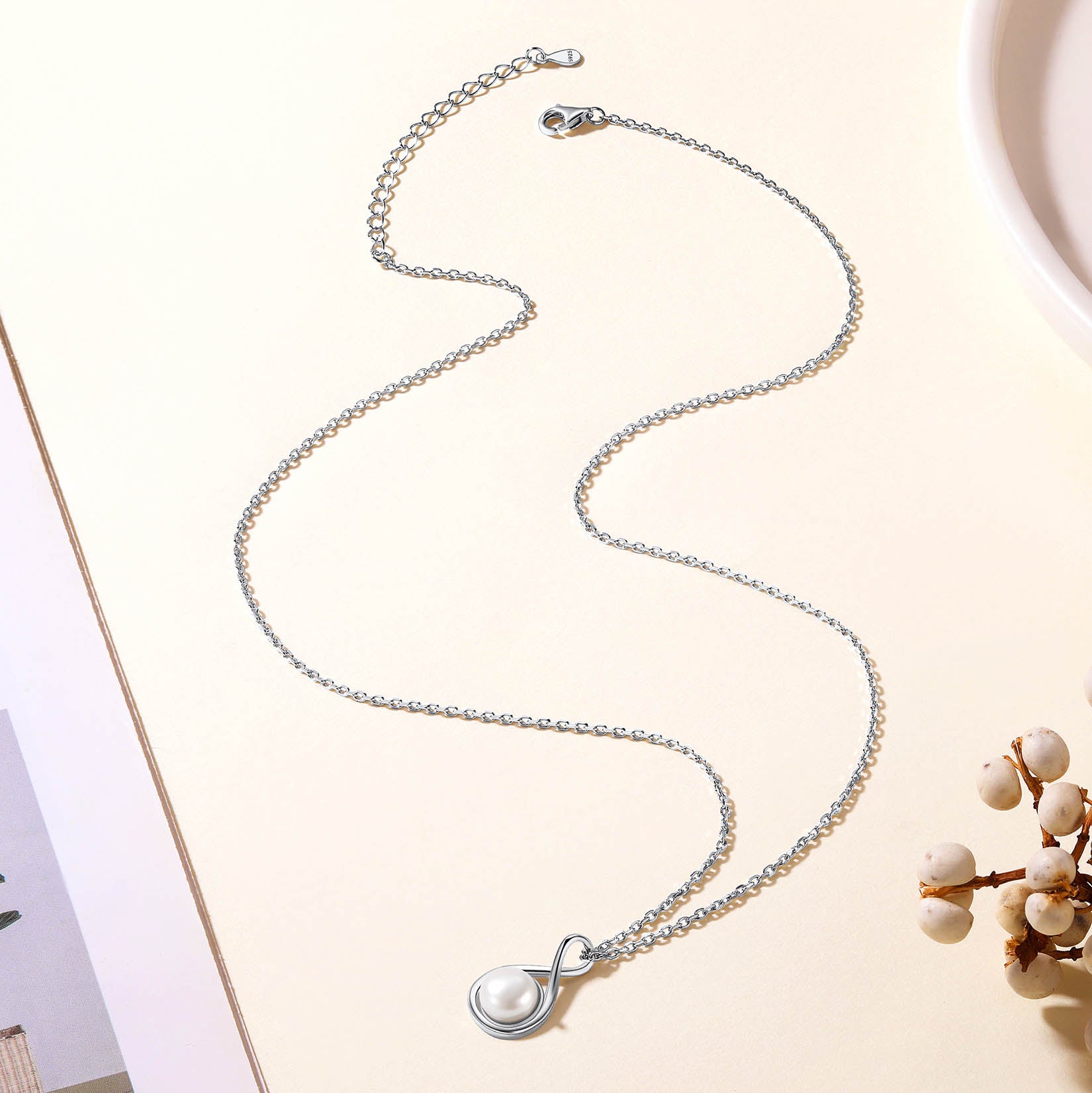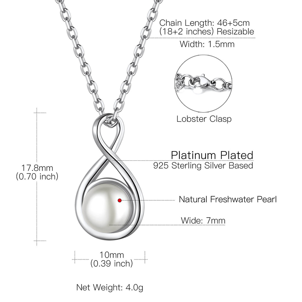 Classic sterling silver infinity pearl pendant charm necklace for women and girls, uses handpicked natural freshwater pearls. Nickel free, lead free, is safe for sensitive skin. Infinity symbolizes endless love. Ideal gift choice for Christmas, Anniversary, Valentine's Day, Mother's Day, and Birthday to your loved one.
