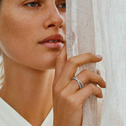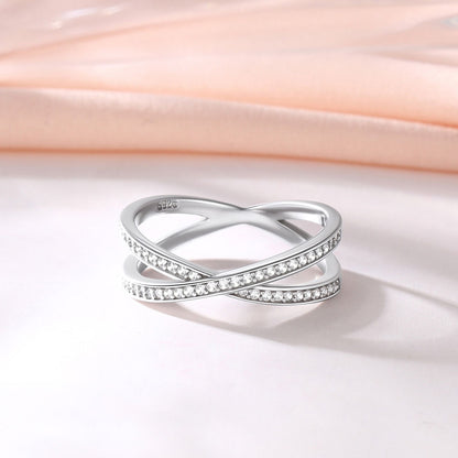 Cette bague à bande croisée présente des diamants en zircone cubique éblouissants dans un design élégant, ce qui en fait une alliance alternative parfaite ou une bague empilable, idéale pour les bijoux de mariée minimalistes et les vêtements de tous les jours.