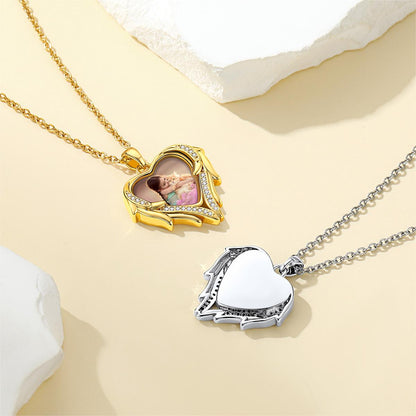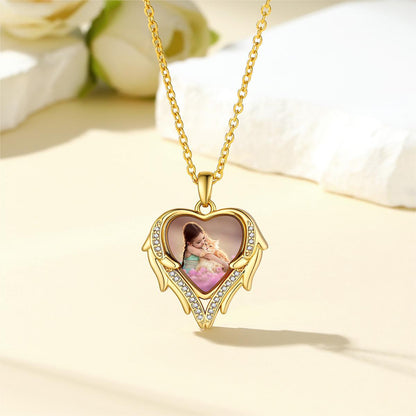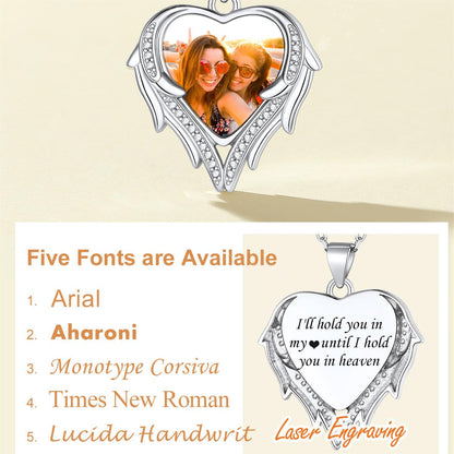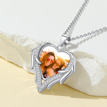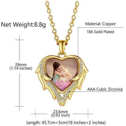 Collier photo personnalisé en zircone cubique avec cœur et ailes. Avec la photo de vos proches ou d'un événement important gravée sur le pendentif, gardez de précieux souvenirs près de votre cœur. Ce collier personnalisé en forme de cœur signifie que vous serez toujours dans mon cœur. Un cadeau idéal pour vos proches ou pour vous-même !