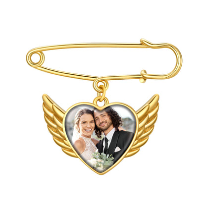 Créez un hommage durable avec notre Broche photo personnalisée en forme d'aile d'ange. Ce bijou photo est parfait comme broche commémorative, breloque pour bouquet de mariée, souvenir de remise de diplôme ou hommage funéraire. Un cadeau idéal pour les anniversaires, les mariages ou comme témoignage de tendresse pour une personne chère à votre cœur.