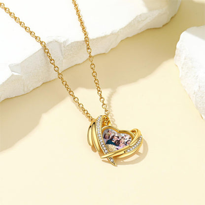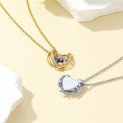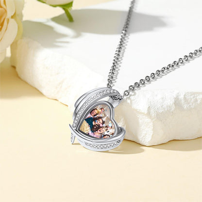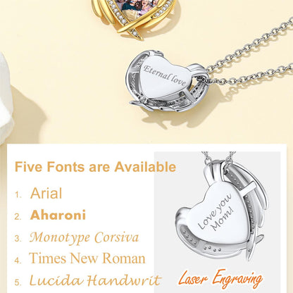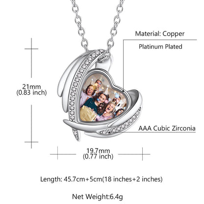Collier photo personnalisé en forme d'ailes d'ange en zircone cubique. Avec la photo de vos proches ou d'un événement important gravée sur le pendentif, gardez de précieux souvenirs près de votre cœur. Ce collier personnalisé en forme de cœur signifie que vous serez toujours dans mon cœur. Un cadeau idéal pour vos proches ou pour vous-même !
