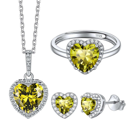 Elevate your style with our halo heart birthstone jewelry set. Crafted with sterling silver and AAA+ cubic zirconia, this stunning set includes a radiant necklace, matching earrings, and a beautiful ring. Each piece is adorned with a halo of sparkling stones that beautifully frame your birthstone, adding a touch of sparkle and color to your outfit.