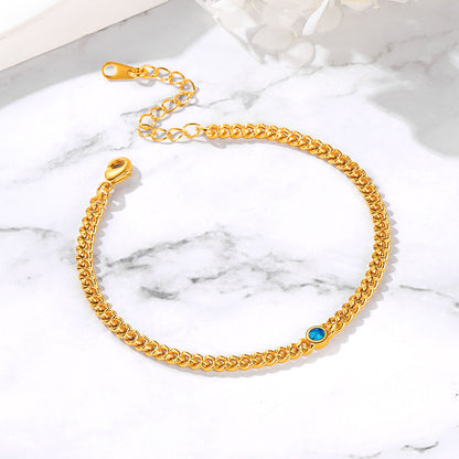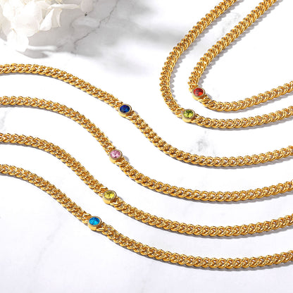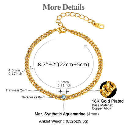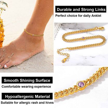 Anklet is a very fashion piece of jewelry. Show off your shapely legs or summer tan with this Cuban link anklet, the delicate birthstone design gives this on-trend foot bracelet a brilliant shine to your ankles. Made of copper alloy with 18K gold plated, nickel-free and lead-free, safe for sensitive skin. Whether with jeans, a summer dress, or on the beach, this simple anklet takes you from day to night with style.