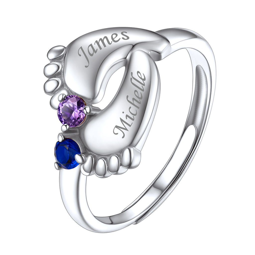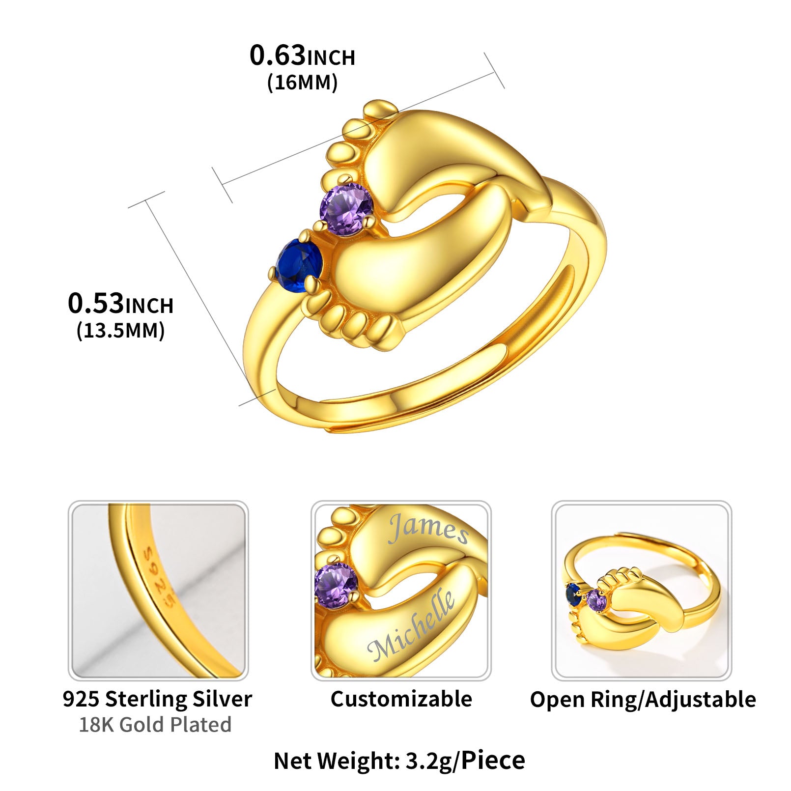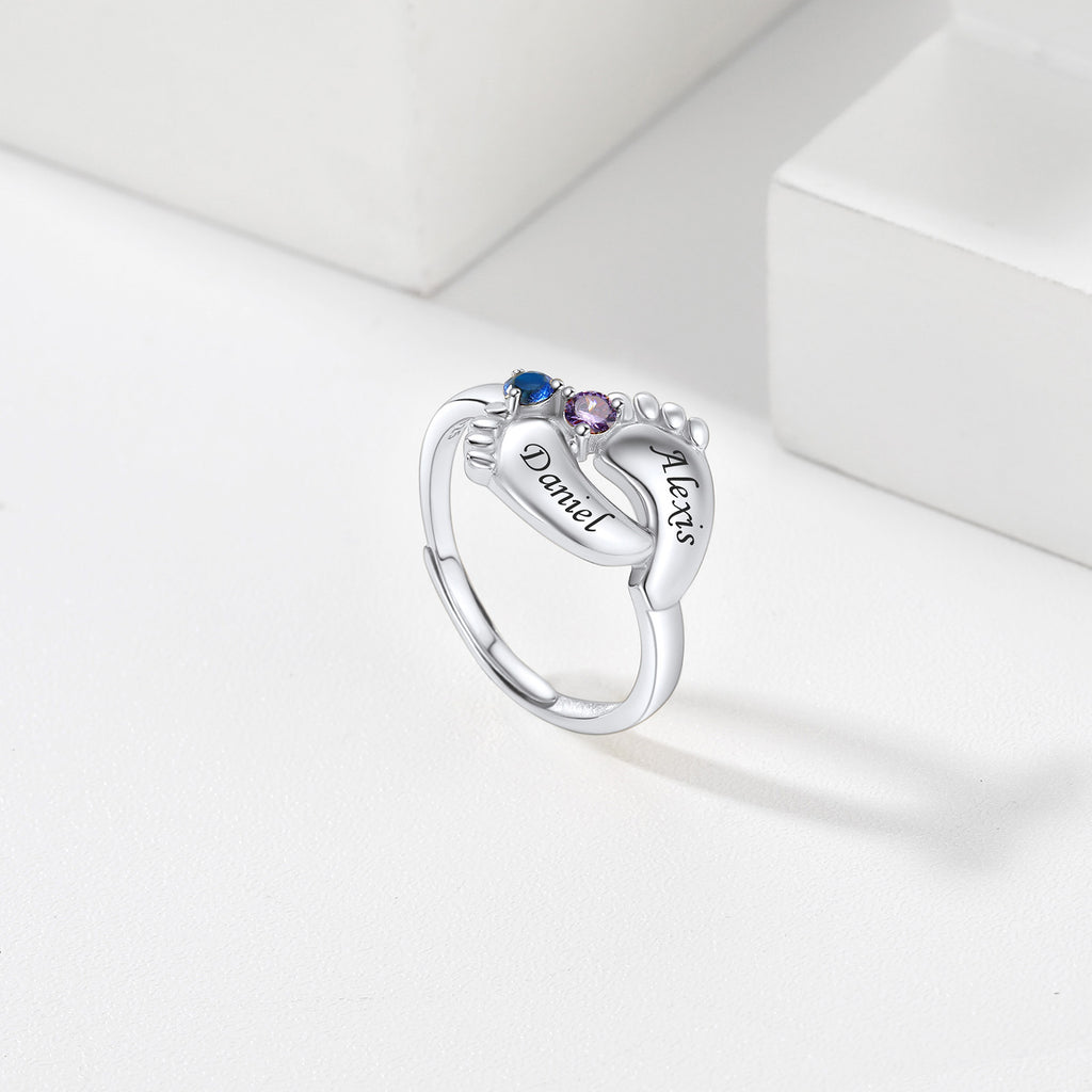 Celebrate the special bond between mother and child with this custom footprint ring. It features 1 to 4 delicate baby footprints, each paired with birthstones and engraved names. This personalized mother's ring is perfect for various occasions, including gifts for new moms, Mother's Day jewelry, or birthday presents.
