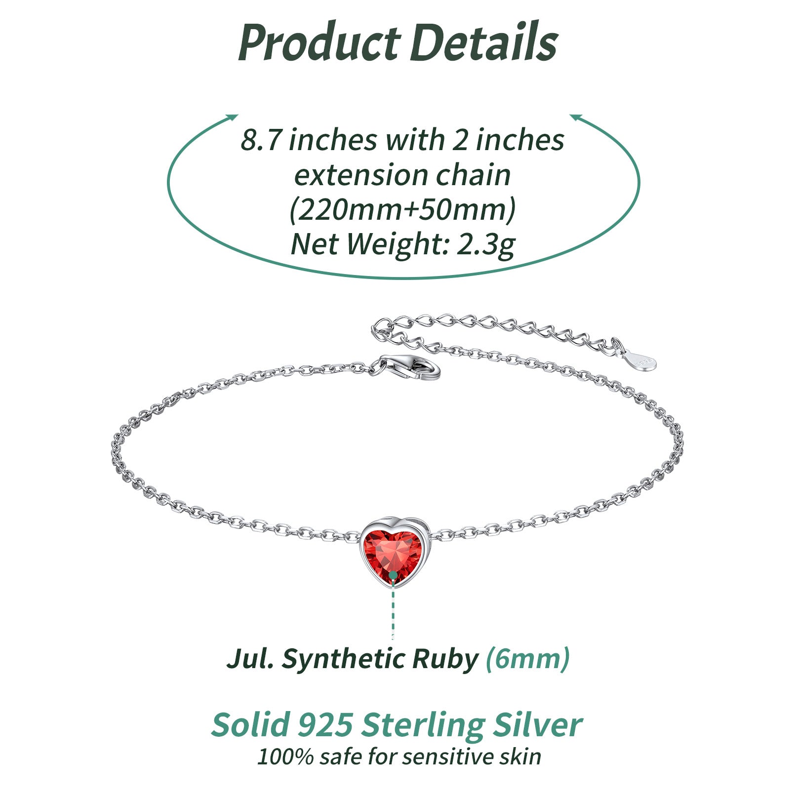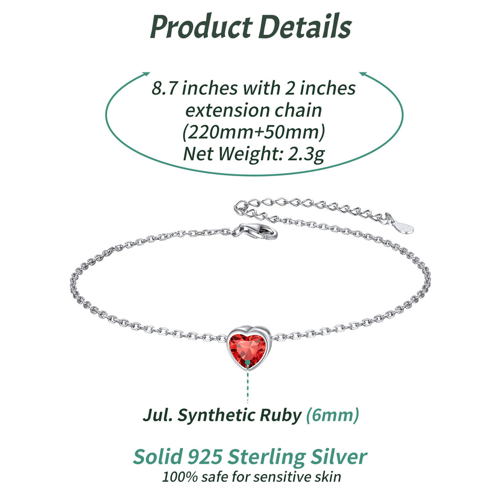 Simple sterling silver heart birthstone chain anklet for women and girls, perfect match with summer, beach and dress. Nickel free, lead free, is safe for sensitive skin. Everyone has their own lucky birthstone, it will bring you healthy, luck and happiness. Ideal gift choice for Christmas, Anniversary, Valentine's Day, and Birthday to your loved one.