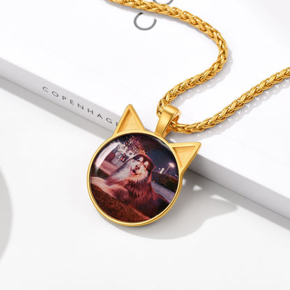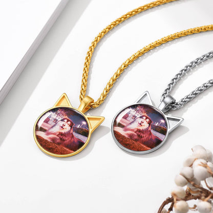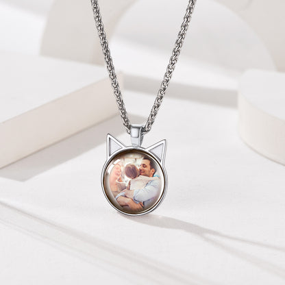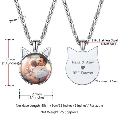 Custom cat necklace with picture. Personalized a picture on the front side and engrave Name, Birthday, Letter, Initial, Symbol, Faith, Inspirational words on the other side. Stainless Steel Memory photo necklace, which is solid and durable, is a good way to keep your loved pet or beloved one close to your heart at all times.