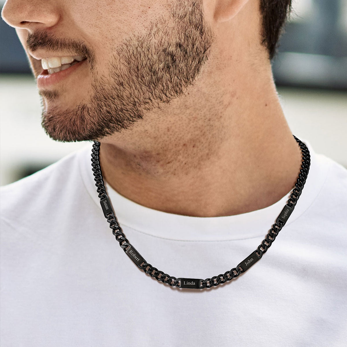 Personalized Cuban Link Chain with Names - This men's chain necklace features 1 to 6 engravable bars. Personalize this sleek piece with your kids' names, significant dates, or meaningful phrases to make it uniquely yours. It can be worn alone or layered for a versatile look. Crafted from durable stainless steel, this multiple-name chain includes a secure lobster clasp for easy wear.