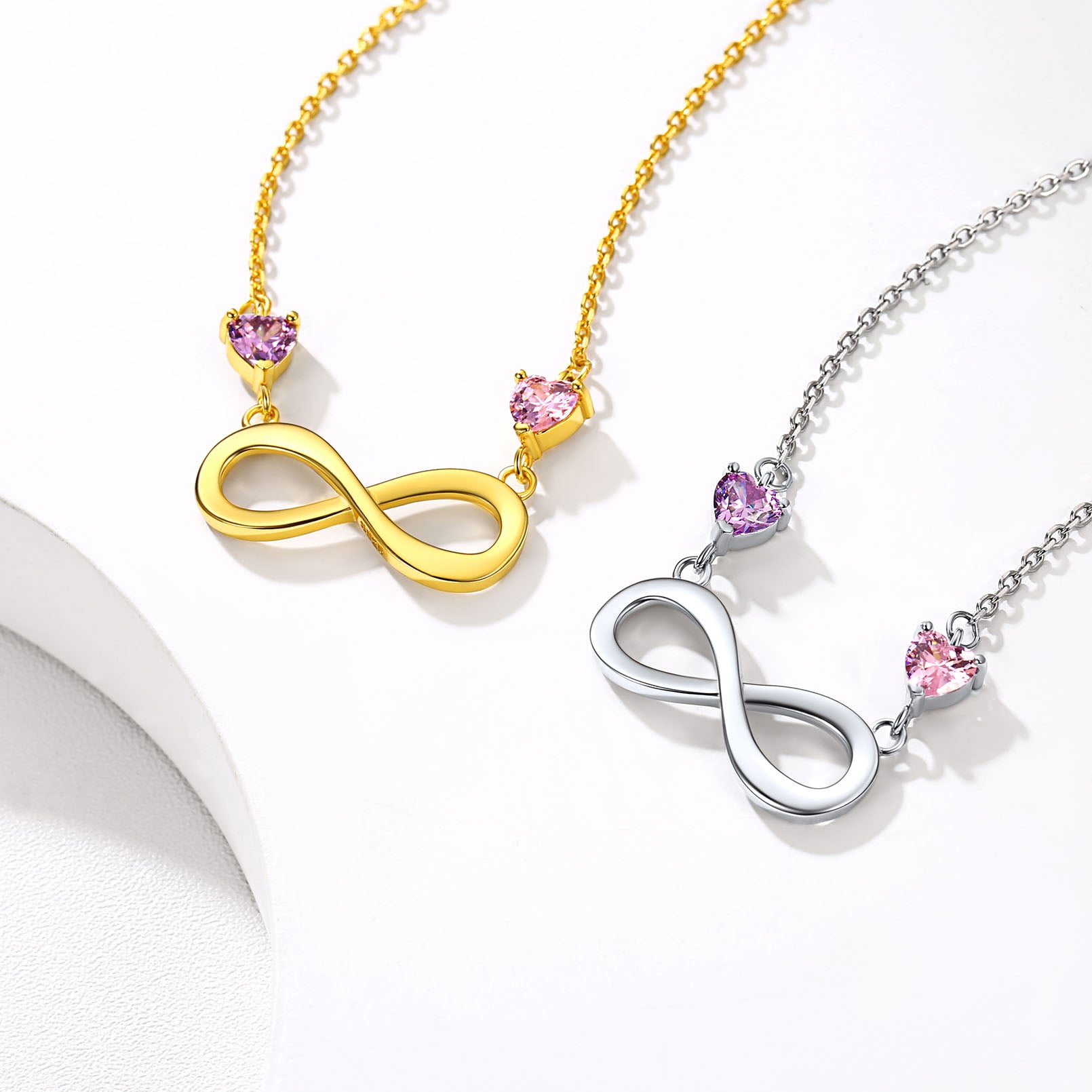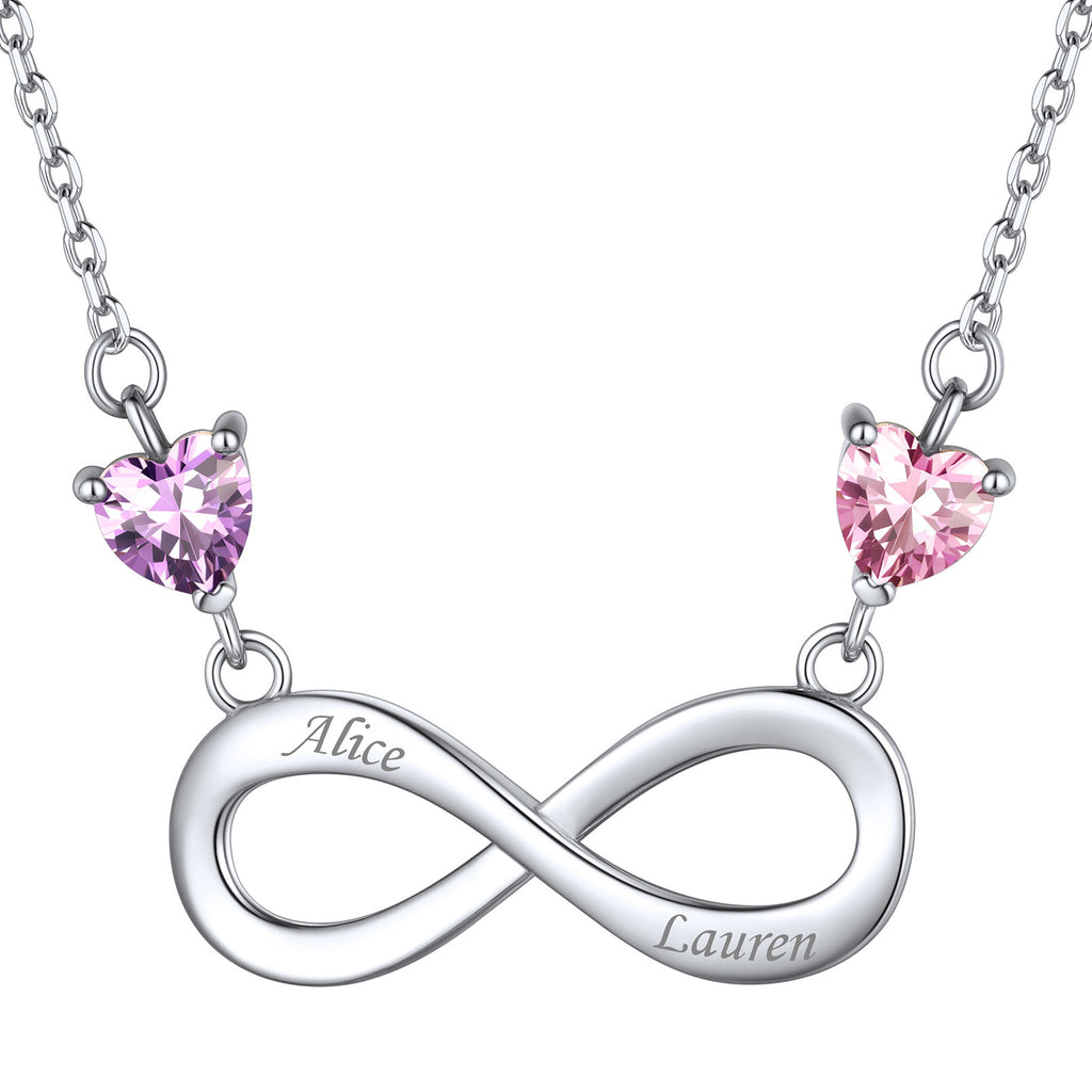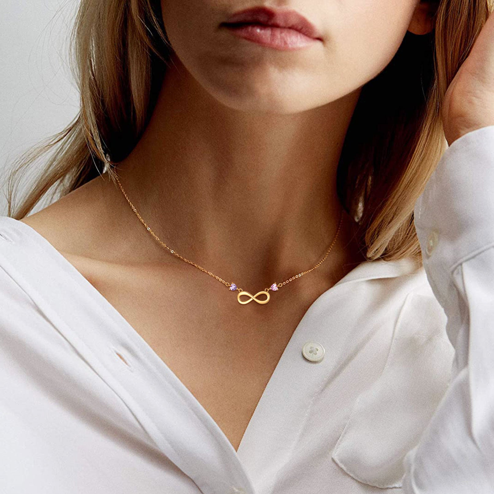 Dainty sterling silver heart birthstone infinity necklace, custom text on the infinity pendant, a perfect collectible jewelry gift for women and girls on anniversary, birthday, Valentine's Day, Christmas, or Mother's Day. Every time you offer someone an infinity pendant, you are indicating that your friendship and love will have no end and will go on forever.