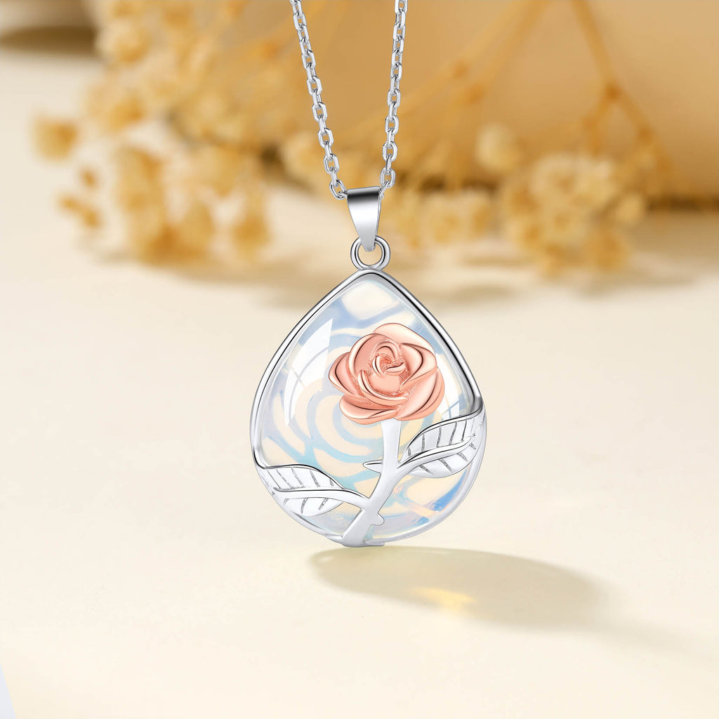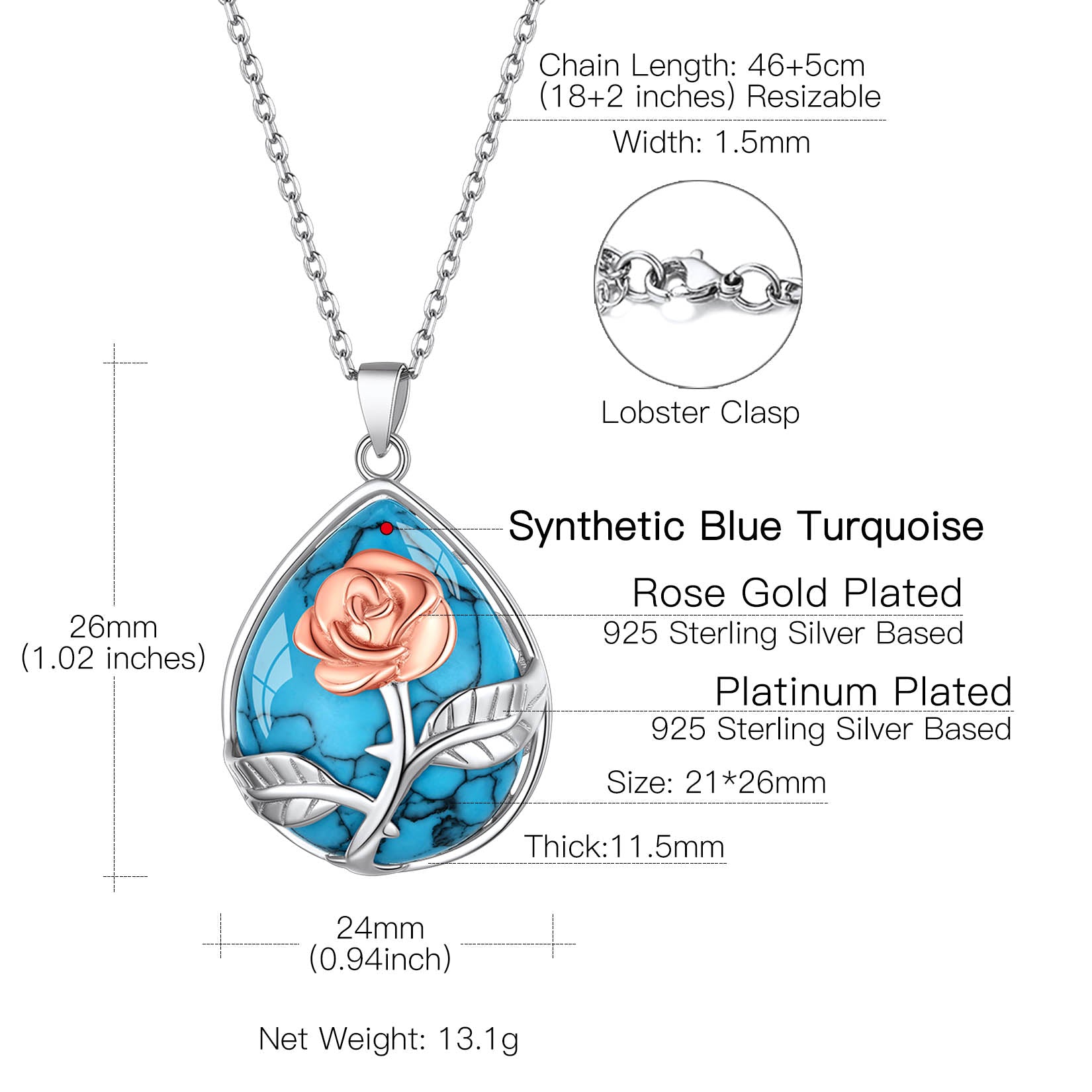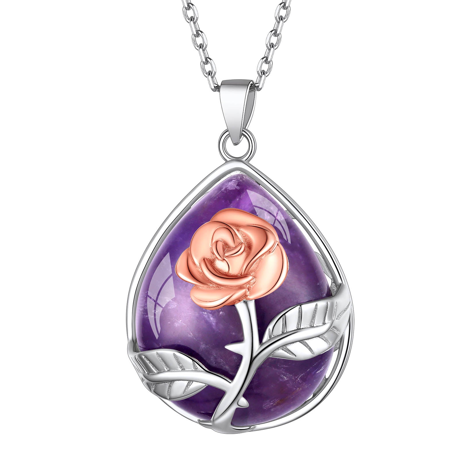Exquisite sterling silver rose flower water drop healing crystal necklace, rose flower symbolizes romantic love. Love is never-ending. The rose flower birthstone necklace is set with created crystal, each stone is carefully selected and polished to set off your beautiful temperament. Each pendant is made of natural stone, the color may be slightly different from pictures, please subject to the actual product you received.