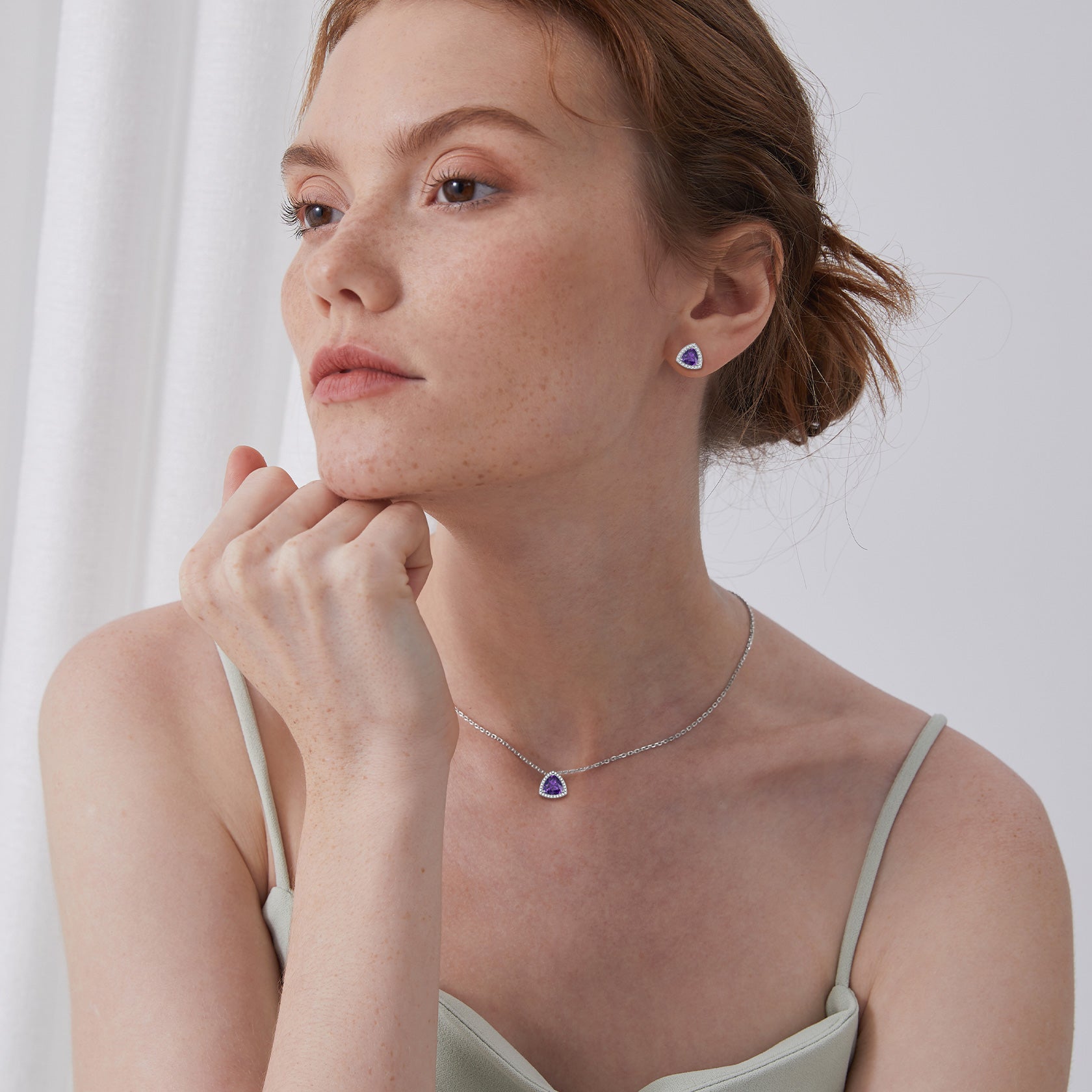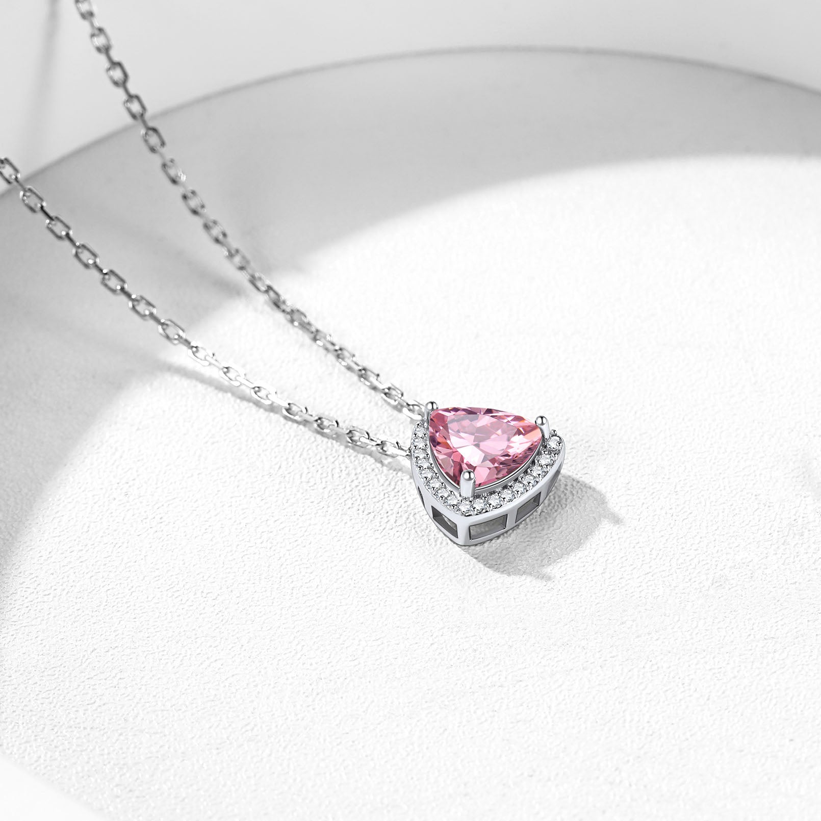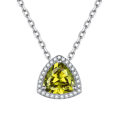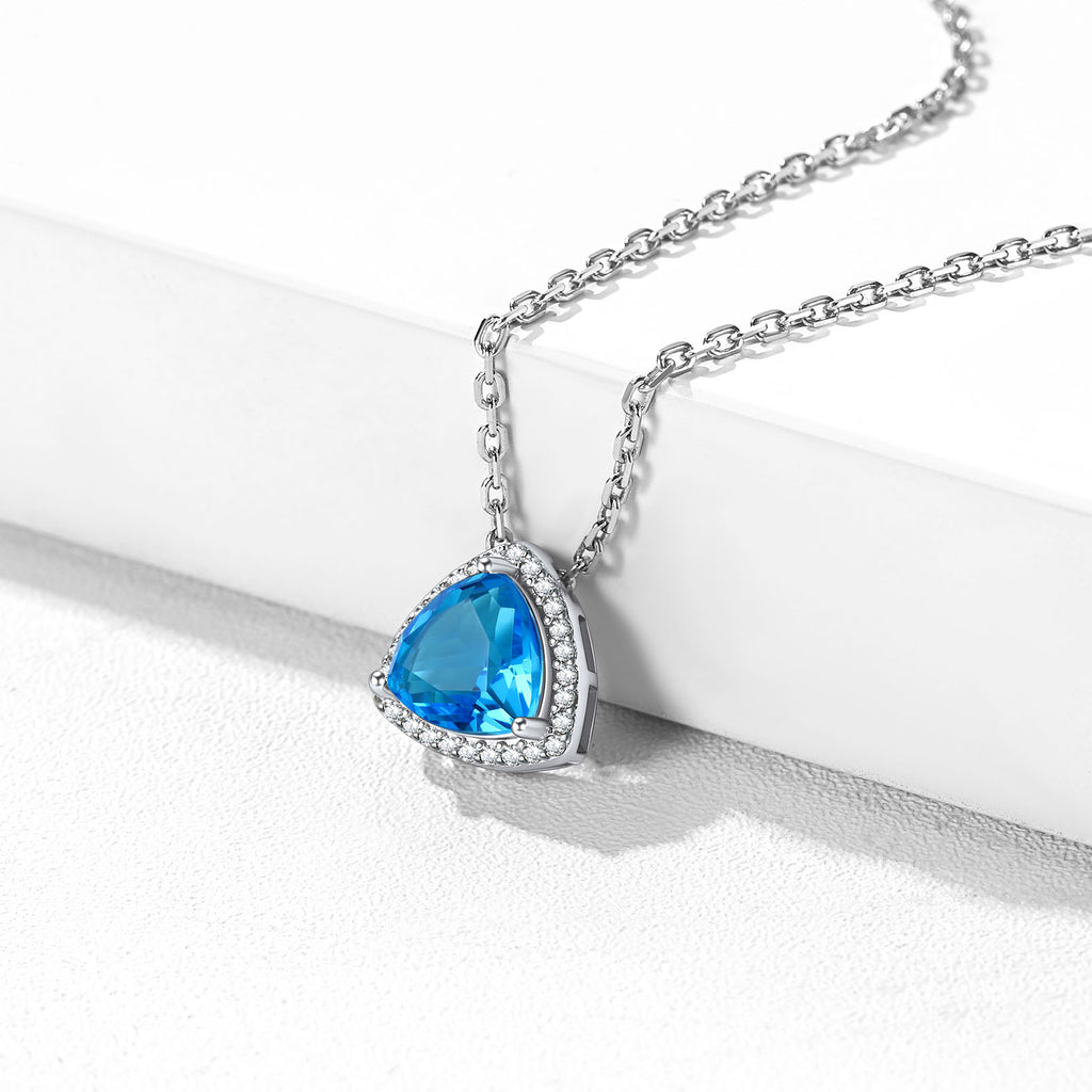 One big shiny triangle shape created birthstone, circled by small cubic zirconia twinkling stones, fashionable and luxurious touch, you can wear this triangle halo birthstone necklace daily or at special events and impress everyone with your unique style.